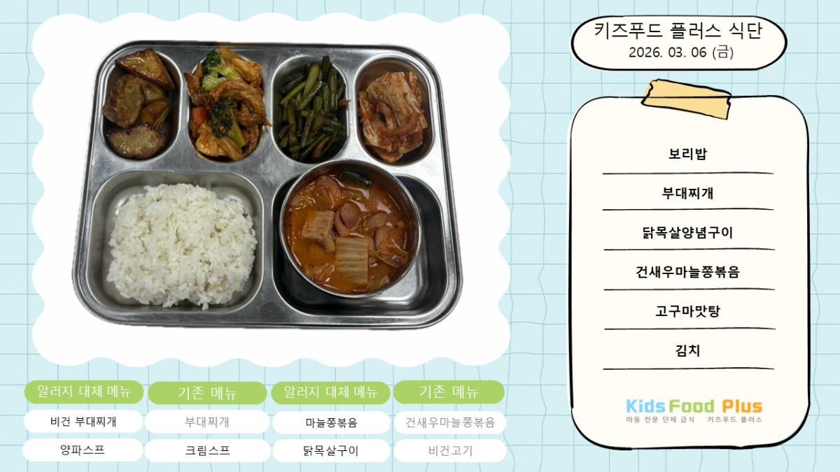 2026년 3월 6일 금요일 페이지 정보 목록 본문 2026년 3월 6일 금요일 이전글2026년 3월 9일 ~ 13일 식단 안내 26.03.06 다음글2026년 3월 5일 목요일 26.03.05 댓글 0 댓글목록 등록된 댓글이 없습니다.
